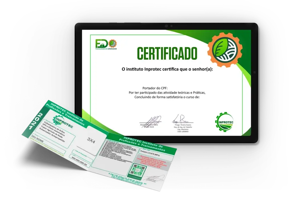 Além disso, você ainda recebe a sua carteirinha do operador personalizada para levar facilmente para todos os cantos e comprovar sua qualificação e conhecimento técnico sobre máquinas agrícolas.